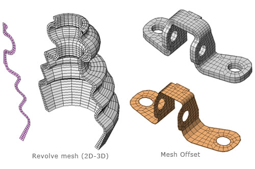 Options include extrude, sweep, revolve, project, fill and offset 2D mesh profiles into 3D sets.