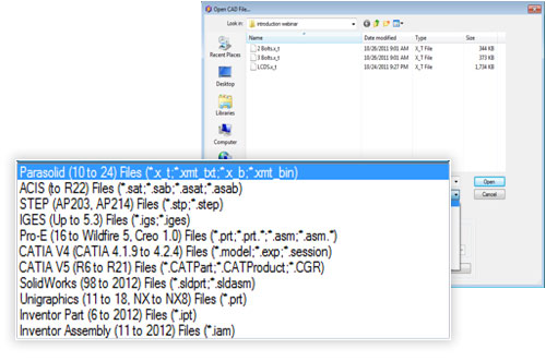 Supported formats include: CATIA, Inventor, Pro-E/Creo, Solidwords, Solid Edge, Parasolid, Unigraphics, ACIS, STEP, IGES, etc.