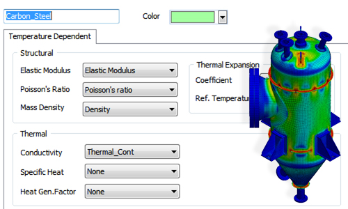 midas NFX support material models depending on temperature through the input of different material curves.Temperature dependent materials are useful to investigate models highly dependent on temperature like pressure vessels